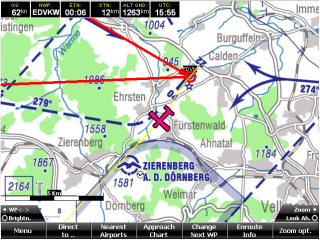 Bei Annäherung an einen Flugplatz der geplanten Route wird die Anflugkarte automatisch eingeblendet. Anflugkarten können auch jederzeit als Vorschau angezeigt werden:
