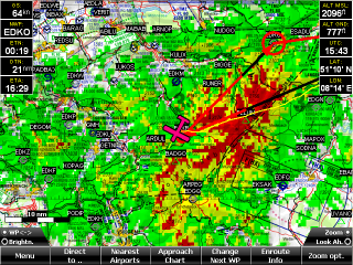 DAs Niederschlagsradarbild aus pc_met kann transparent über der Karte eingeblendet werden (unbegrenzt zoombar). Mittels Satellitenmodem ist eine zyklische Aktualisierung (z.B. alle 15 min.) im Flug möglich.
